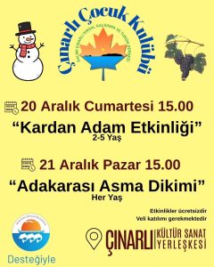 20 Aralık Cumartesi 15.00’te kardan adam etkinliği ve 21 Aralık Pazar 15.00’te coğrafi işaretli Adakarası asması dikimi için çocukları bekliyoruz